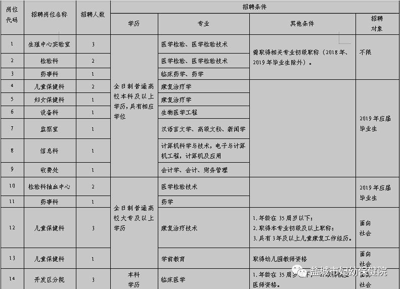 4、年龄在30周岁及以下(1988年6月30日及以后出生),对年龄有特殊要求的,以岗位表中注明的为准。具体报考岗位要求的资格条件详见《盐城市妇幼保健院2019年上半年公开招聘编外专业技术人员岗位表》;
