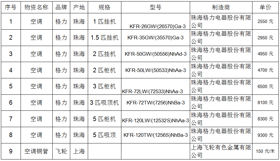 备注:所有空调报价均需包含上楼安装费、均为含税价。