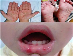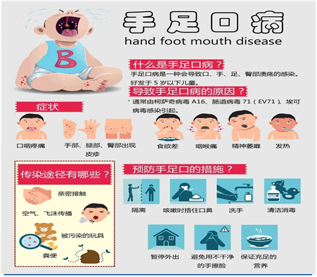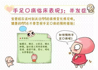 手足口病是由肠道病毒引起的传染病,多发生于5岁以下儿童,可引起手、足、口腔等部位的疱疹,有时候也会出现在臀部、大腿内侧、会阴部、膝、肘等部位。少数患儿可引起心肌炎、肺水肿、无菌性脑膜脑炎等并发症。一般病程约5~10天,多数可自愈,预后良好。个别儿童可出现泛发性丘疹、水疱,伴发无菌性脑膜炎、脑炎、心肌炎,甚至肺水肿、出血、心肺功能衰竭等而引起死亡。