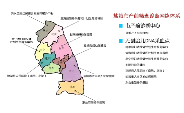 目前盐城地区唯一具有产前诊断资质的医院是盐城市妇幼保健院,负责开展本地区无创胎儿DNA产前筛查和产前诊断。为了方便孕妇就诊和疫情防控,我院已建立盐城地区区域网络化服务,市里7家县级产前筛查机构都为采血点,提供该地区无创筛查采样服务。有需求的孕妇可以就近到采血点进行相关咨询及采样,对于高风险或有禁忌症等的孕妇需及时转诊至盐城市妇幼保健院产前诊断中心进行专业遗传咨询及有创产前诊断。