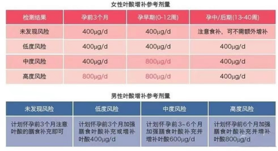 叶酸在体内无法合成,只能通过外源性摄入。根据《围受孕前增补叶酸预防神经管缺陷指南》,健康女性备孕时每日补充0.4mg或0.8mg叶酸。那是不是叶酸补得越多越好呢?其实不然,不少临床实验数据证明:长期过量摄入叶酸后,其吸收和代谢达到饱和而在体内蓄积,由此可能增加子代肥胖、2型糖尿病、过敏性疾病、自闭症、癫痫甚至肿瘤疾病的发生风险。目前我们可以通过叶酸代谢基因检测和血药浓度检测等手段,实现叶酸补充的精准化。其中叶酸代谢基因检测在孕前优生检查中就占有一席之地,它是对人体的叶酸代谢是否存在异常进行一种检查。依据检测结果有以下几种叶酸补充方案: