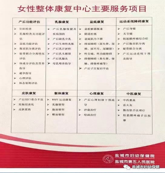女性整体康复中心隶属于妇女保健科,主要开展产后42天全面健康体检、产后催乳与乳腺疏通、母乳喂养指导、产后子宫复旧不良的治疗、产后虚寒、身痛的治疗、产后形体恢复、产后妊娠纹的淡化、产后腹直肌分离的治疗、产后耻骨联合分离、盆底功能康复治疗(包括各种尿失禁、轻度子宫脱垂,阴道前后壁膨出、阴道松弛症等)、更年期颈肩腰腿痛等相关康复问题的治疗。(详见下图)