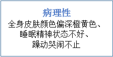 特点:黄疸出现早,在生后24小时内出现;黄疸发展快,程度重;黄疸持续时间长(足月儿>2周,早产儿>4周);黄疸退而复现;除黄疸外,伴有其他异常情况,如反应差、精神萎靡、厌食。肌张力低,继而易激惹、高声尖叫、呼吸困难、惊厥或角弓反张、肌张力增高等。引起新生儿病理性黄疸的原因很多,如:溶血、感染、饥饿、便秘,出血等,需立即到医院诊治。