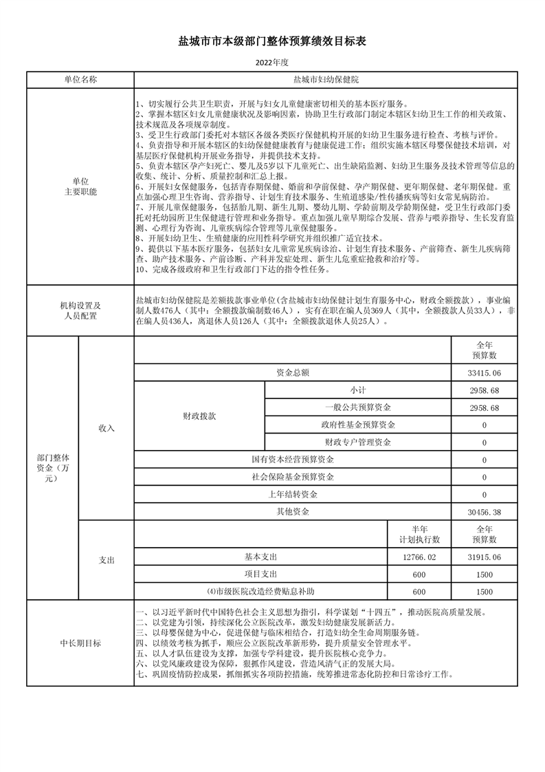 盐城市市本级部门整体预算绩效目标表