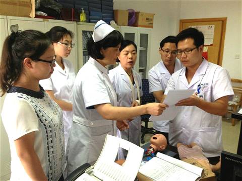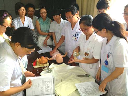 培训班首先由王秀华对“新生儿窒息复苏的基本流程”进行了详细的理论阐述,重点强调了CPAP的操作步骤与胸外按压与气管插管人工通气的配合的操作要点。接着,王秀华、李梅现场进行了新生儿窒息复苏的操作示范。最后,王秀华、蔡志勇,李梅、包道成组成两个考核小组分别对86名参培人员进行了107人次的新生儿窒息复苏技能操作考核。